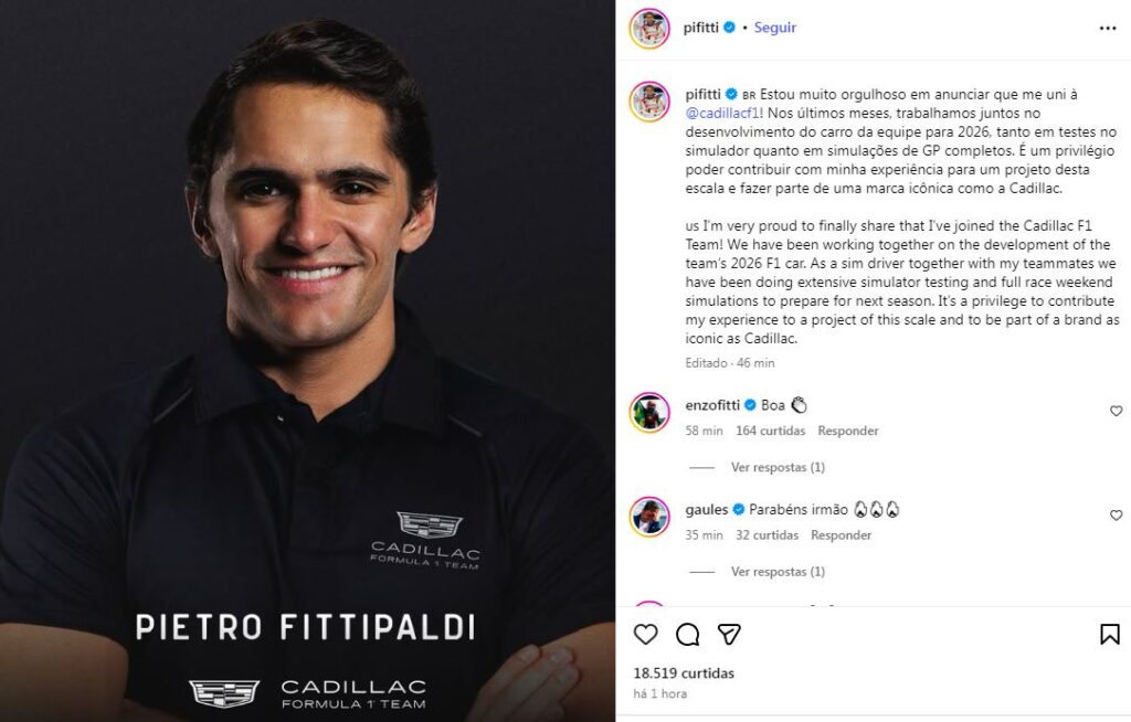 Em post nas redes sociais, Fittipaldi comemorou a nova conquista. “Estou muito orgulhoso em anunciar que me uni à Cadillac! Nos últimos meses, trabalhamos juntos no desenvolvimento do carro da equipe para 2026, tanto em testes no simulador quanto em simulações de GP completos. É um privilégio poder contribuir com minha experiência para um projeto desta escala e fazer parte de uma marca icônica como a Cadillac”.