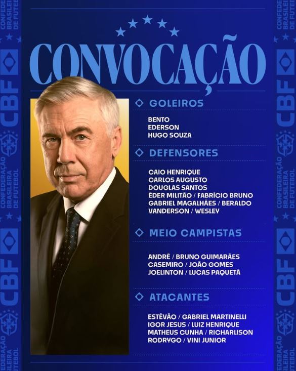 O técnico Carlo Ancelotti anunciou nesta quarta-feira (1º), às 15h, a lista dos 25 convocados da Seleção Brasileira para os amistosos contra Coreia do Sul (10/10) e Japão (14/10), preparatórios para a Copa de 2026. A coletiva trouxe novidades como o jovem Estêvão do Chelsea, e Igor Jesus do Botafogo, ao lado de nomes consolidados como Vini Jr., Rodrygo e Bruno Guimarães, além da volta de Éder Militão.