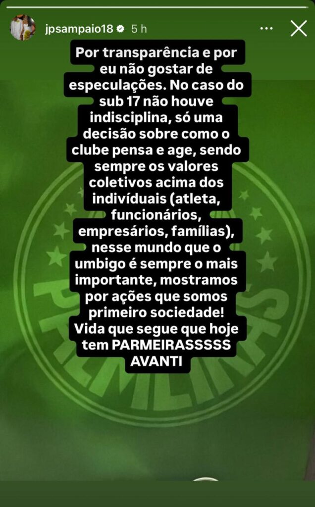 Em postagem nas redes sociais, Sampaio negou indisciplina, enfatizando que a medida visa reforçar a filosofia de formação do clube: “Nesse mundo que o umbigo é sempre o mais importante, mostramos por ações que somos primeiro sociedade. Vida que segue que hoje tem Palmeiras. Avanti”.