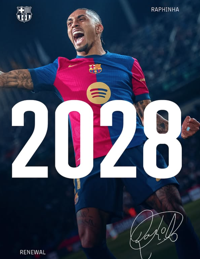 No perfil oficial do Barcelona nas redes sociais, Raphinha agradeceu o carinho após renovar o contrato com o clube. “Estou muito contente. Espero seguir aqui por muitos e muitos anos”. O jogador que chegou ao clube em 2022 soube aproveitar a boa fase durante a temporada 2024/25 no comando de Hansi Flik, chegando a ser um forte candidato à Bola de Ouro deste ano. Nos anos como titular do Barça, Raphinha já fez 34 gols e 25 assistências em 56 jogos.